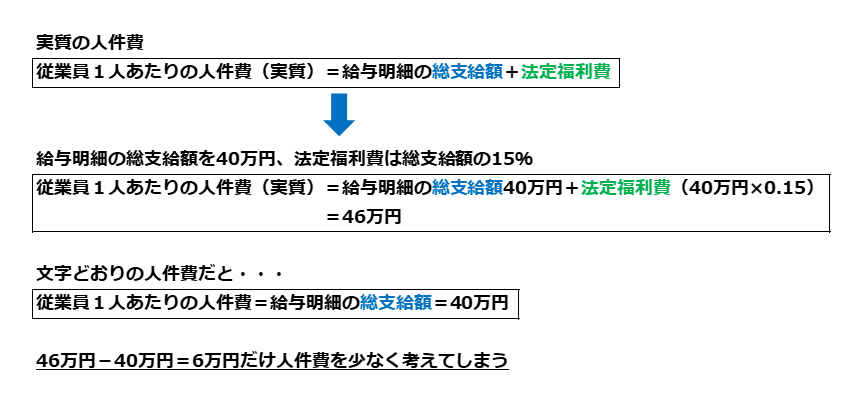 上の例で、従業員1人あたり人件費を6万円少なく考えてしまいます。