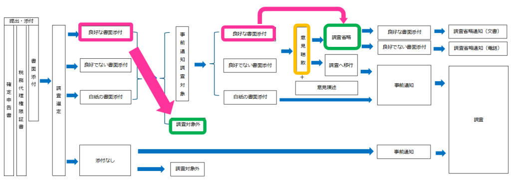 税務署が調査する法人を選んだ後、良好な書面添付があると二段階で「調査対象外(調査省略)」の判断がされます(ピンクから緑の矢印)。