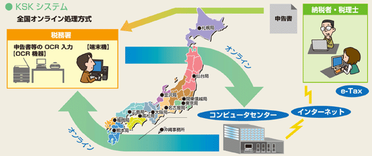 KSKとは、国税庁・全国11ヶ所の国税局・沖縄国税事務所・524ヶ所の税務署を専用のネットワークでつないだコンピュータシステムのことです。